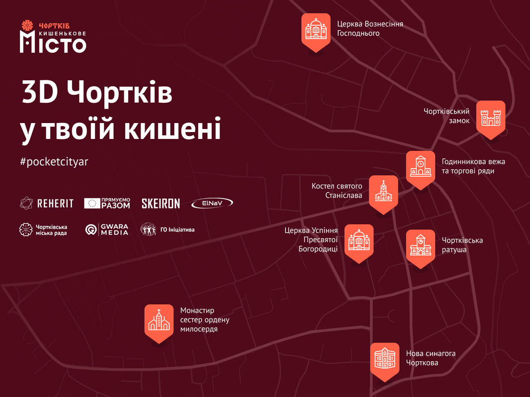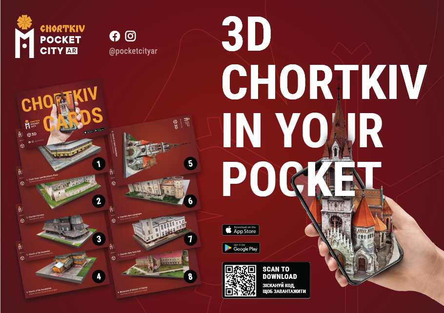 Другим містом, яке ми «поклали у кишеню», став Чортків. Цей проєкт відбувся у співпраці з Центром Ініціатива та за підтримки гранту Re_HERIT та місцевої міської ради. Ми відібрали 8 пам’яток, які відображають культурну багатогранність Чорткова: від старовинної фортеці до міської ратуші й синагоги.